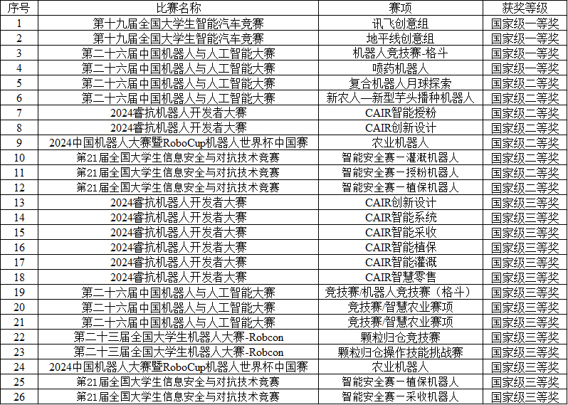 2024年,在學校教務處的大力指導下,我校師生在第十九屆全國大學生智能汽車競賽、第二十六屆中國機器人與人工智能大賽、2024睿抗機器人開發(fā)者大賽、第二十六屆中國機器人與人工智能大賽、第二十三屆全國大學生機器人大賽(Robcon)、第21屆全國大學生信息安全與對抗技術(shù)競賽和2024中國機器人大賽暨RoboCup機器人世界杯中國賽中再創(chuàng)佳績,累計獲全國一等獎4項、二等獎8項、三等獎14項,省級獎項39項。